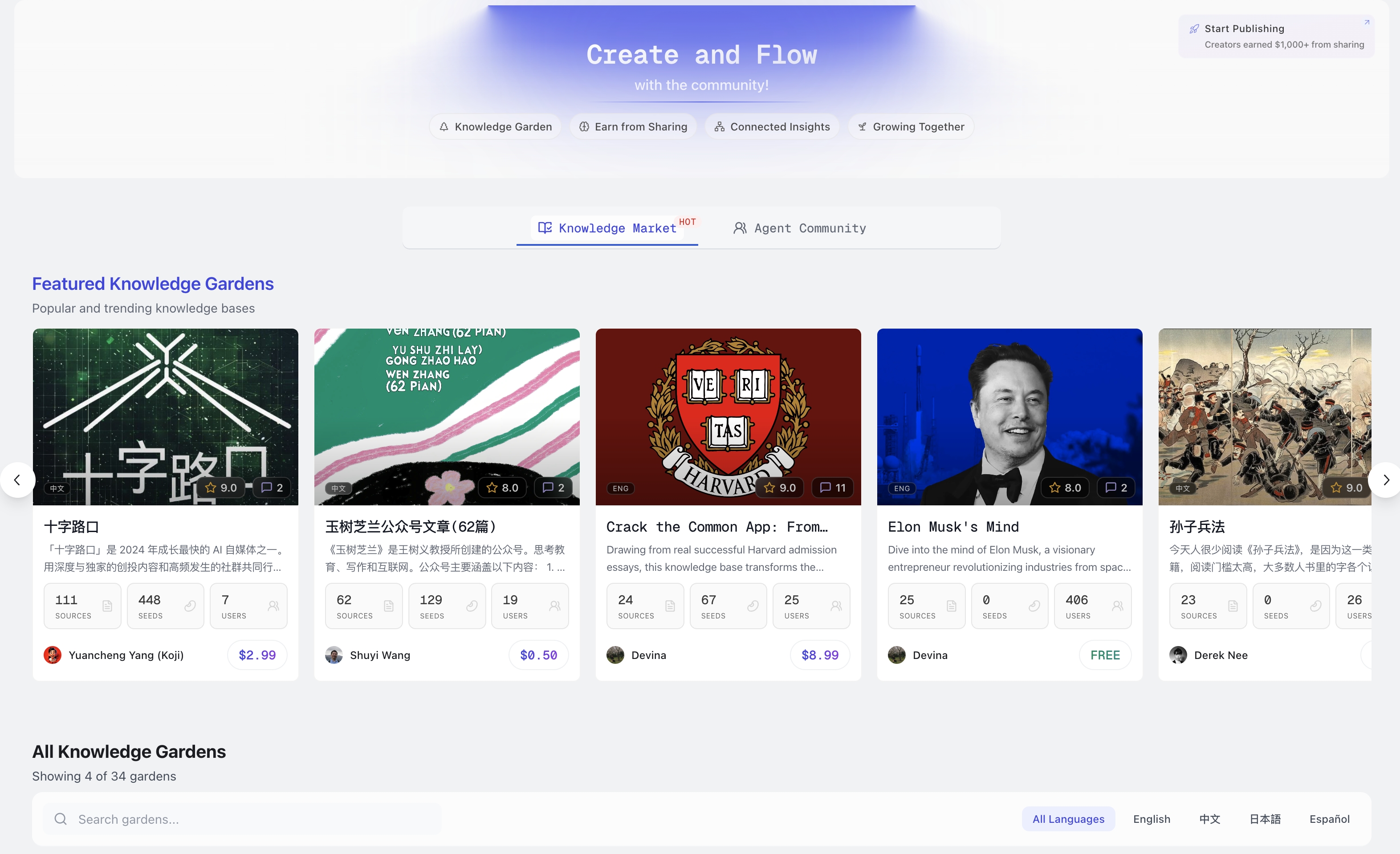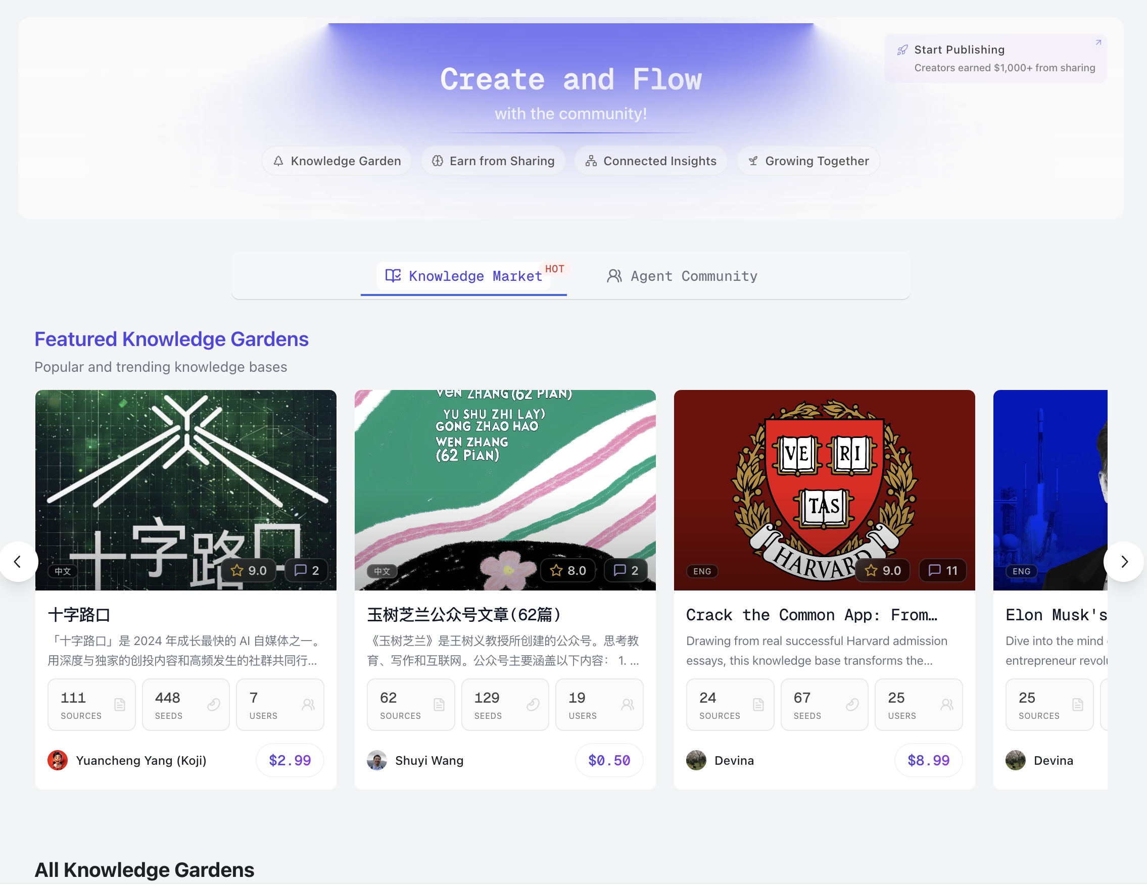 创建一个好的知识库只是第一步：Knowledge Market 是用户进行浏览和购买知识库的平台，flowith 的大量的社区用户在此寻觅适合自己、能够解决自己问题的知识库，并为此付费。明晰且具有吸引力的名字和描述可以帮助你的知识库脱颖而出，获得更多用户的青睐——自然帮助你获取更多潜在收益。