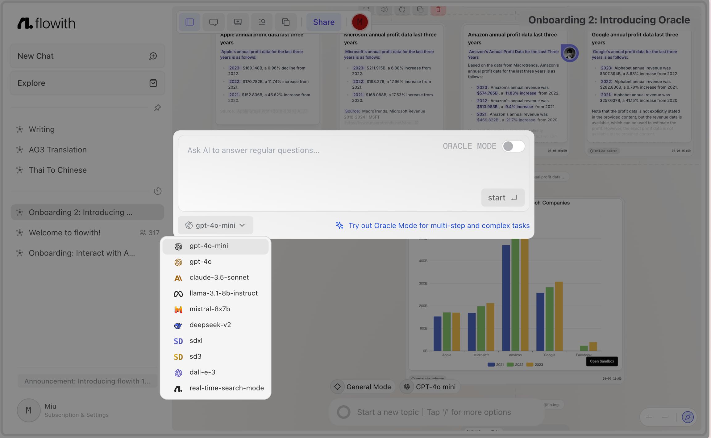Oracle は、AutoGPT などの従来のアーキテクチャと比較して、より成熟した安定したパフォーマンスを発揮します。さらに、flowithのキャンバスベースのインタラクションを活用することで、Oracle はより具体的な手順や包括的な情報をユーザーの皆様に分かりやすく提示することができます。