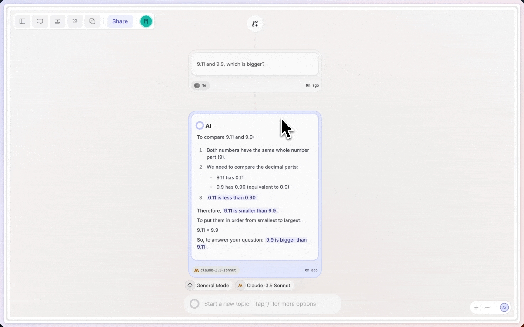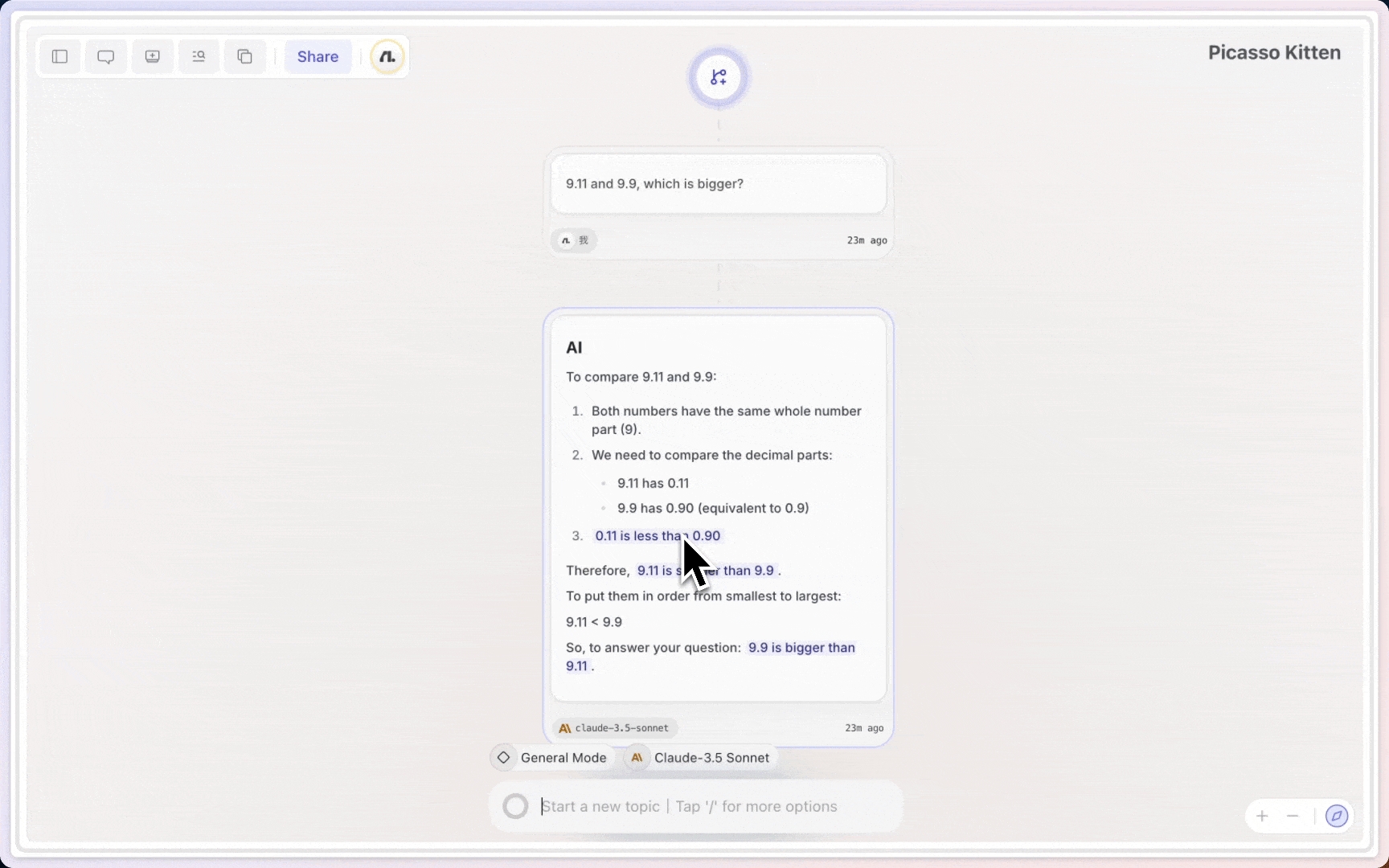 flow モードでは、新しい会話を始めることなく、キャンバス内でモデルを簡単に切り替えることができます。例えば、「9.11と9.9のどちらが大きいか?」 という質問に対して、同じキャンバス上で複数の主要モデルの回答を比較できます。flowith の一般モードでは、ワンクリックでモデルを切り替えるだけでなく、各モデルのこの質問に対するパフォーマンスをキャンバス内に明確に表示します。これにより、結果をより効果的に比較することが可能になります。