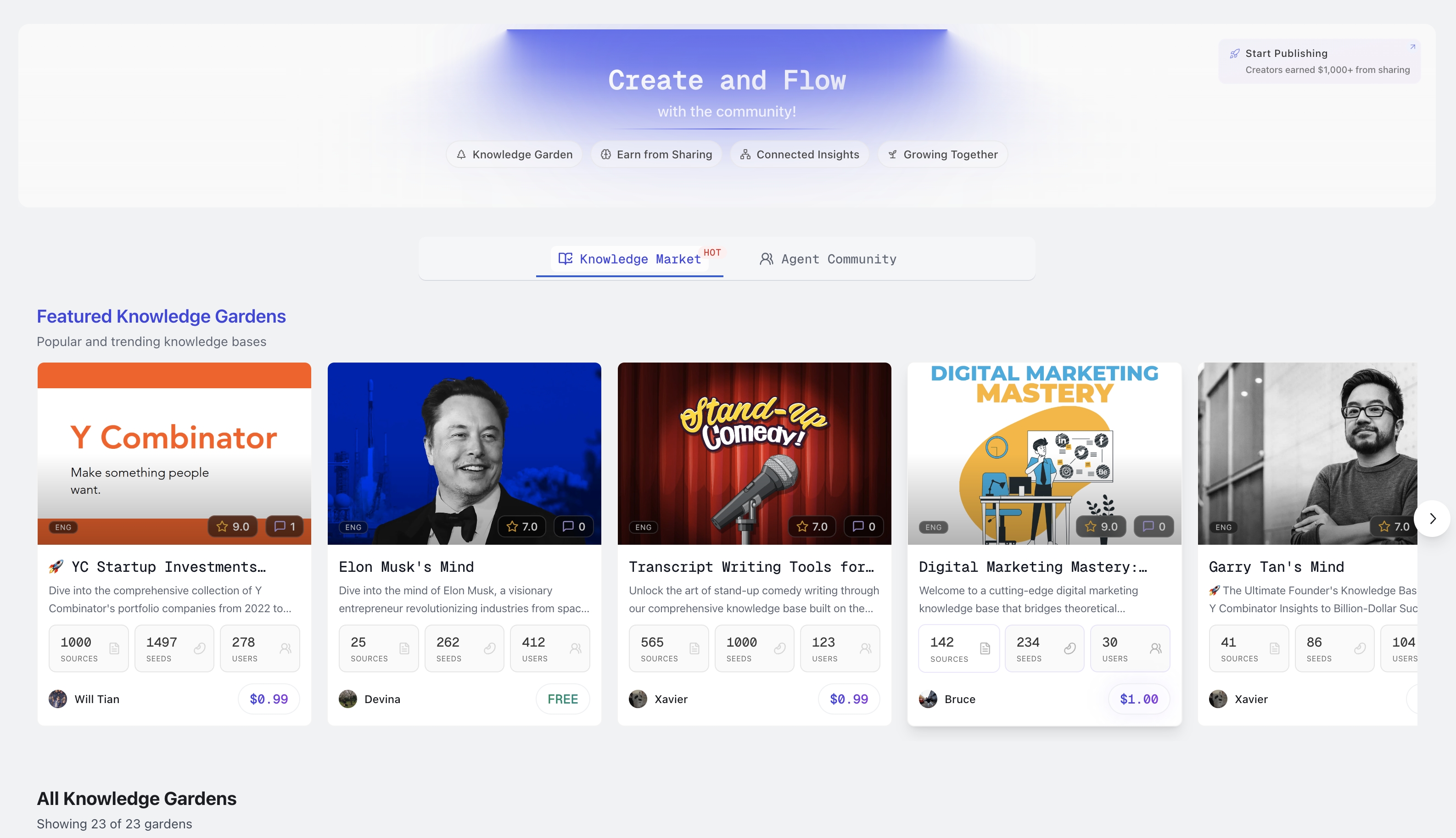 優れたナレッジベースの作成は第一歩に過ぎません：Knowledge Market はユーザーがナレッジベースを閲覧・購入できるプラットフォームです。flowith の多くのコミュニティユーザーは、自分に適した問題解決が可能なナレッジベースを探し、対価を支払っています。明確で魅力的な名称と説明文があれば、あなたのナレッジベースは際立ち、より多くのユーザーから支持を得ることができます——それは自然とより多くの収益につながります。