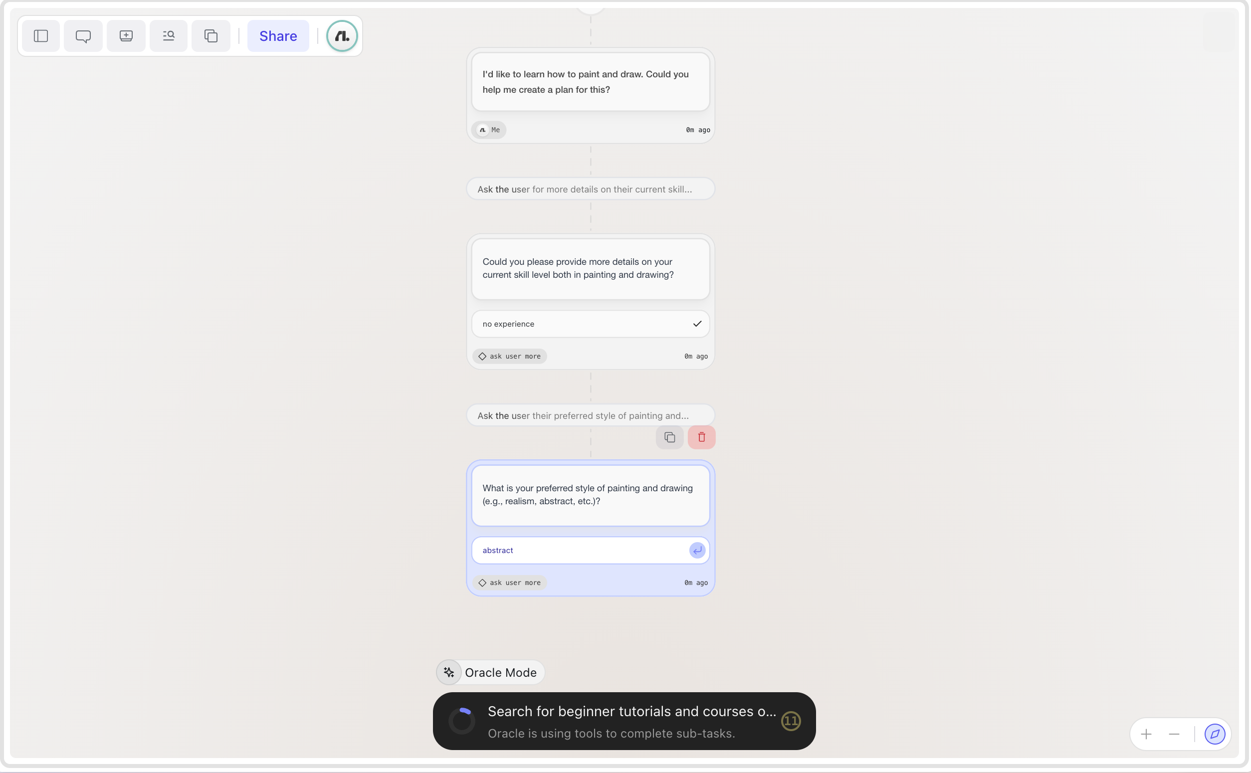 Oracle モードでは、幅広い質問を提示すると、AI が一連の追加質問を通じて問題を絞り込み、具体化していきます：