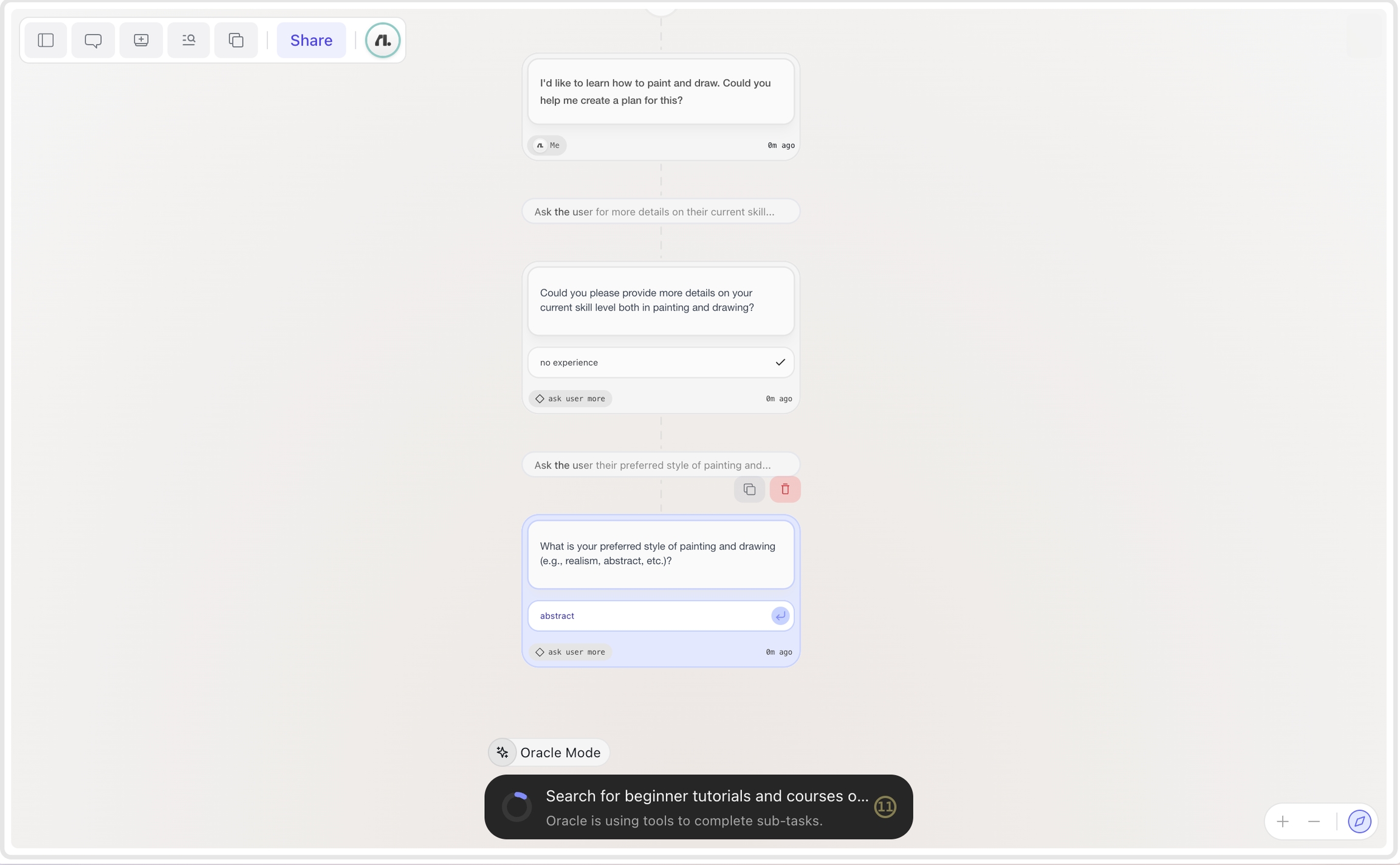 Oracle モードでは、幅広い質問を提示すると、AI が一連の追加質問を通じて問題を絞り込み、具体化していきます: