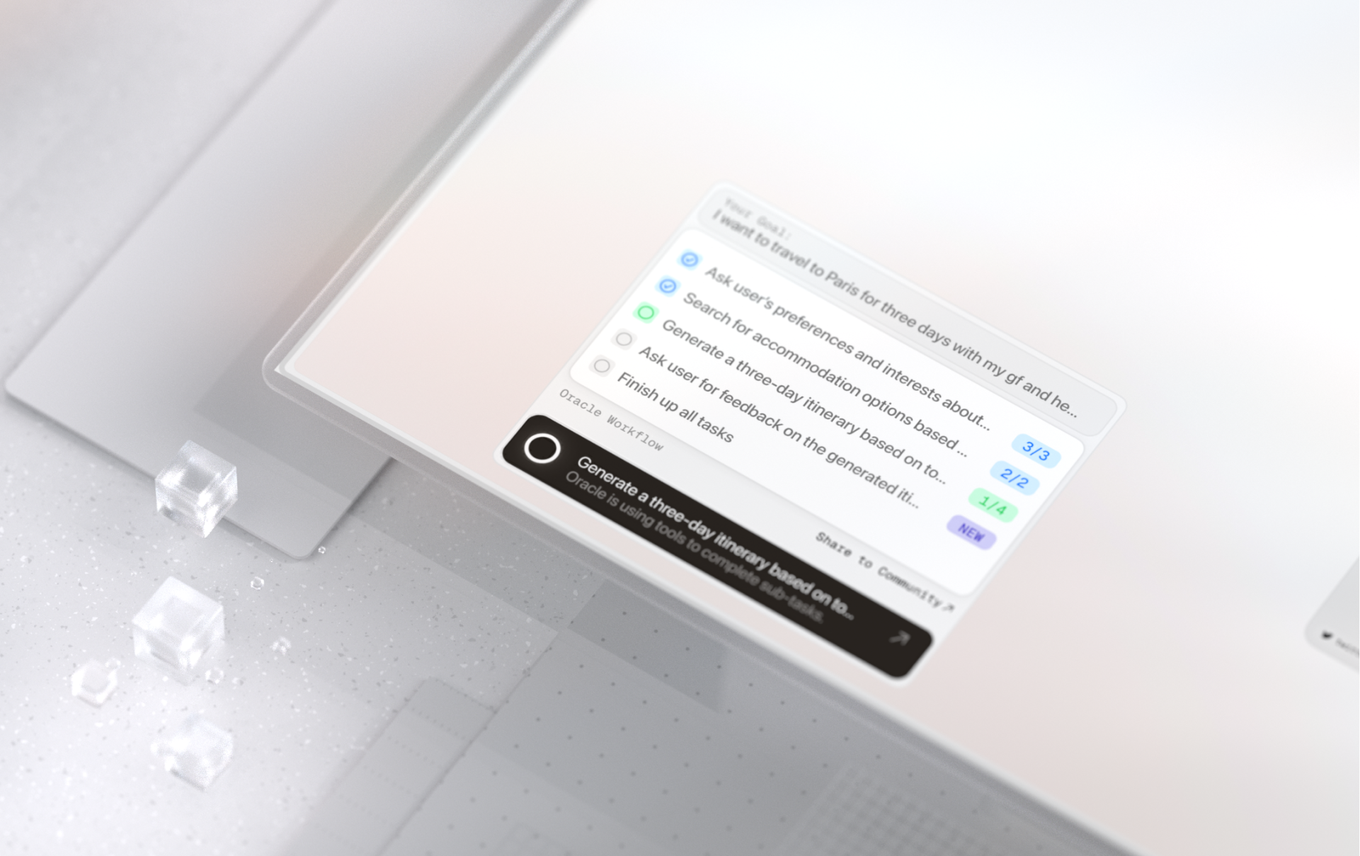 「recipe」 という言葉は、本来、料理の作り方を示す一連の手順を指します。Oracle においては、recipe は AI がユーザーのタスクを完了するために実行する体系的なワークフローを表します。ユーザーが要求や指示を入力すると、Oracle はその全体的な指示を、自身の能力と利用可能なツールに基づいて、より小さなサブタスクに分解します。これらのサブタスクは、その後、タスクアロケーターに渡され、段階的に実行されます。